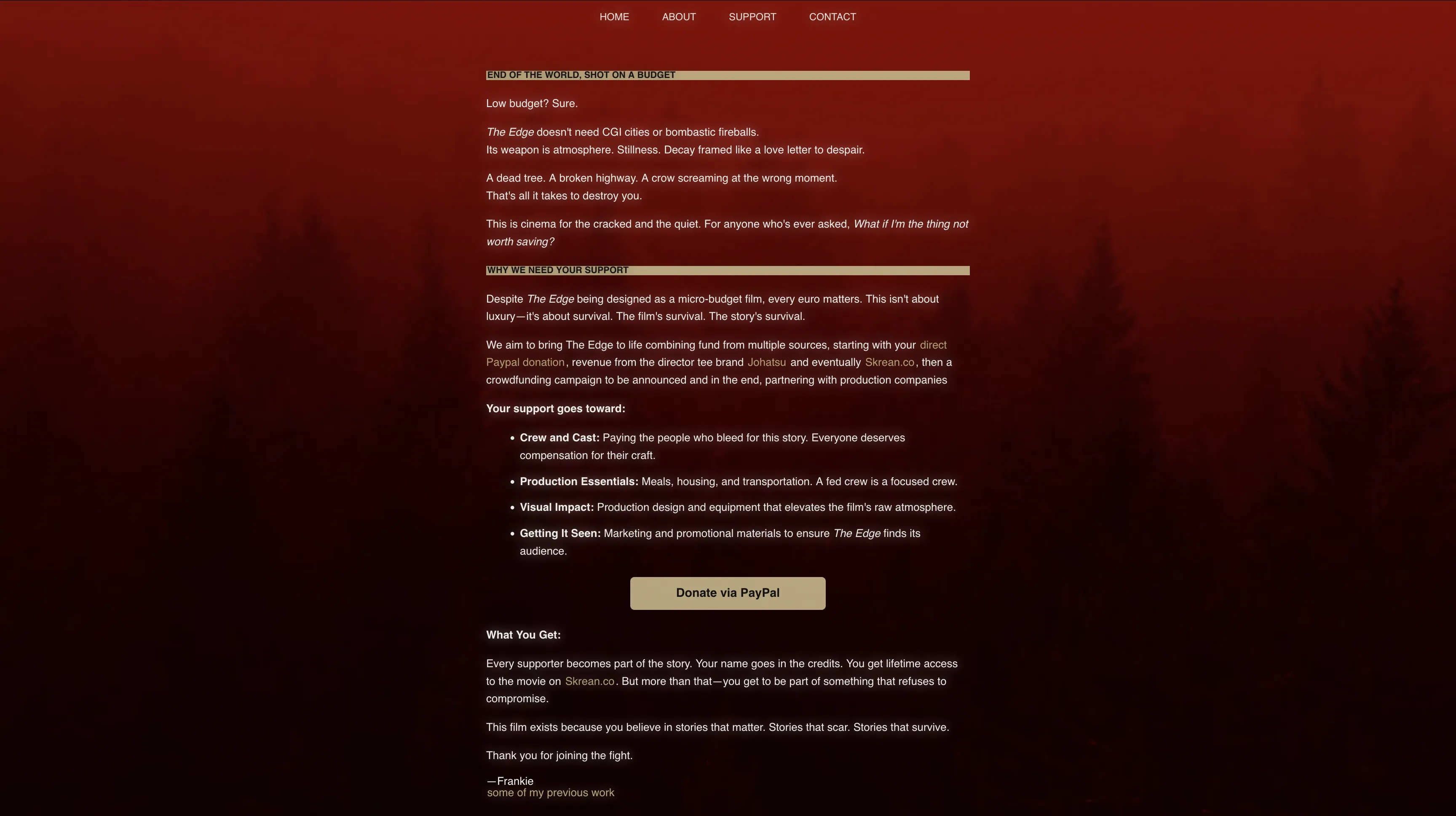 The crowdfunding flopped. Doesn't matter. I'm still building it. Stubborn brick by stubborn brick. This film will live. At any cost.